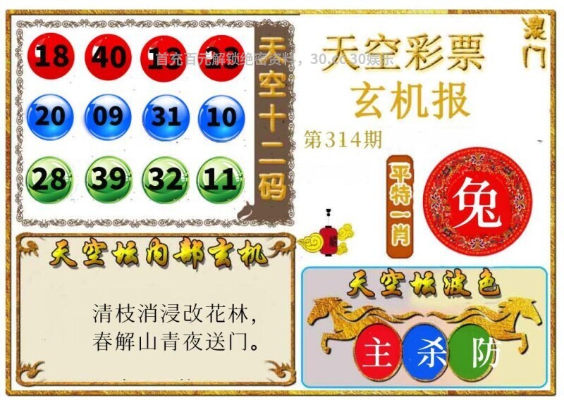 | 314期:天空彩票玄机报 解五肖:羊蛇兔龙牛 解两波:红绿波 |